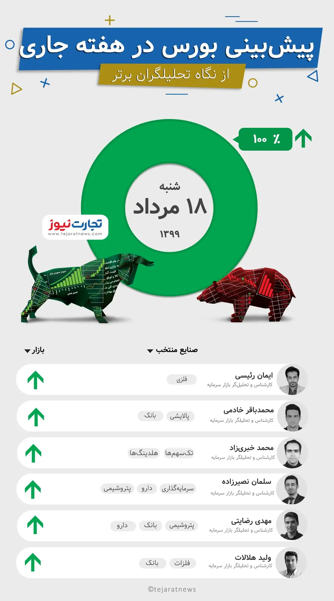 در نظرسنجی این هفته تشش نفر از کارشناسان خبره شرکت کردند که همه آنها نظر به مثبت بودن بازار در هفته پیشرو داشته و گروههای بانک، فلزات، پتروشیمی و داروییها را جزو صنایع پیشرو این هفته عنوان کردهاند.